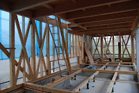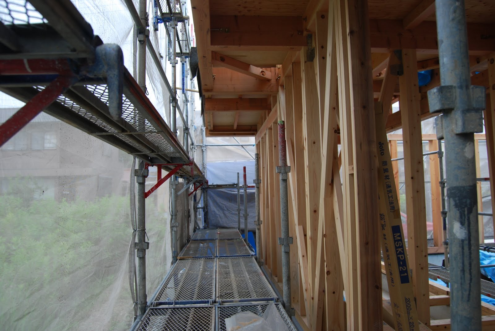 今日、現場でゆっくりと進捗状況を見てきました。全ての筋交いが組み込まれ、床板の土台ができていました。また二階子供部屋には外板が張られ、また屋根のガルバニウム鋼板も準備されていました。