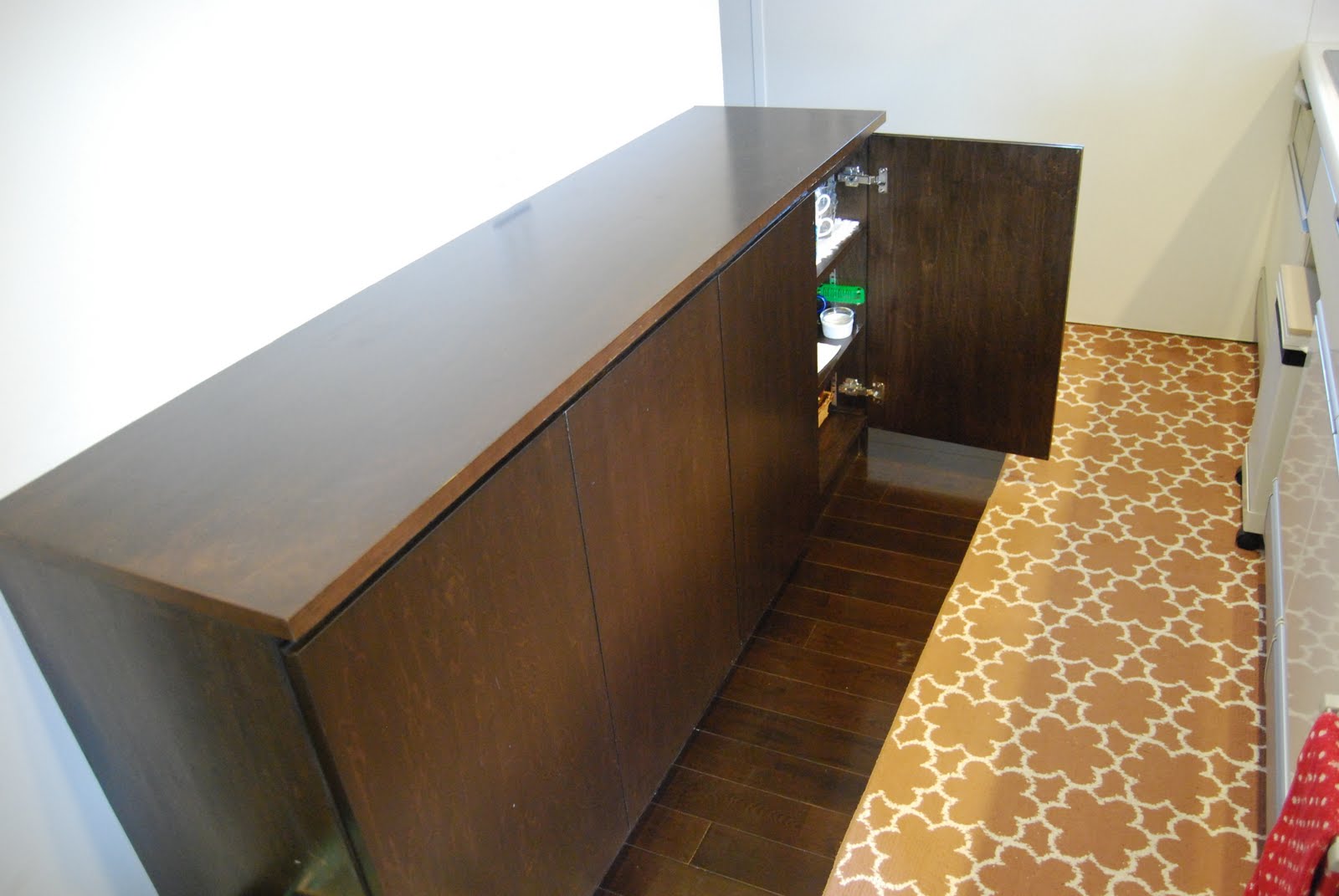 リビングに面した対面式キッチンの後ろには、大工さん作り付けの食器用カウンターと言うものがあり、床色に合わせてダークブラウンで塗装してあります。主に普段使用する食器や、小物類をしまう場所です。リビング側から見えるので、ゴチャゴチャしているとみっともないことになります。昨日、このカウンター上にあった炊飯器や小物類を全て片付けたので、その勢いできれいな状態の写真を撮りました。